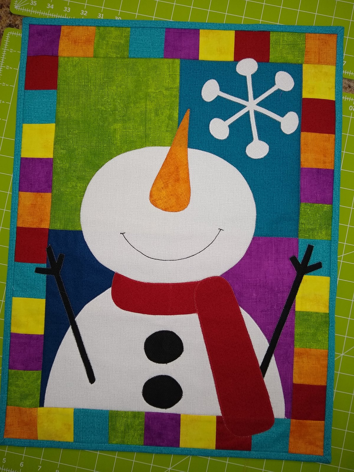 Brighten your winter with this collection of whimsical snowmen. In the class we will be working on the larger snowman wall hanging with some simple pieceing and machine applique.